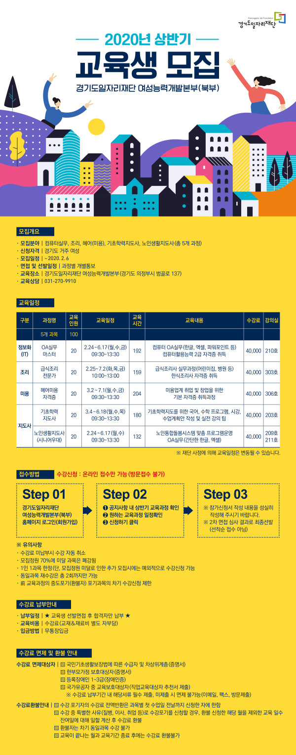 경기도일자리재단, 여성능력 개발 교육생 모집 페이지 정보 작성자 작성자 : 알바스쿨 작성일작성일 : 20-01-30 18:28 조회조회 : 367 본문 청년재단, 청년맞춤형지원사업 모집 목록 준비된 창업하기, 경기도 ‘창업 아카데미’ 눈길